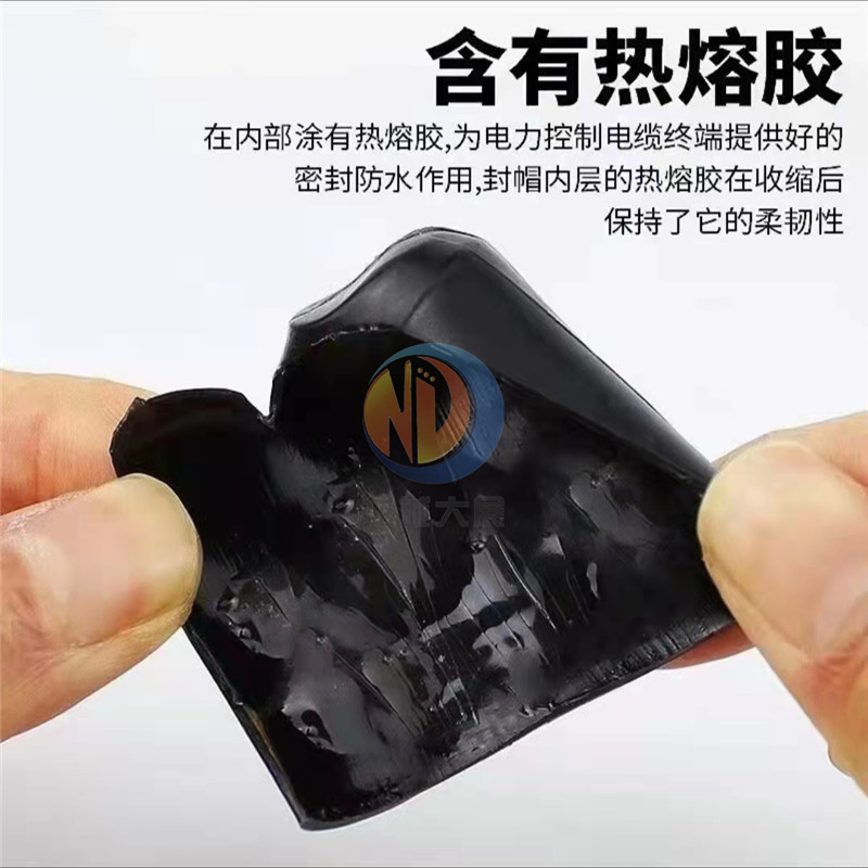 性能:热缩电缆封帽,简称电缆封帽,或者热缩封帽,是一种专门用在管状类端头起到密封保护作用的材料。聚烯烃高分子材料经过自由基夺电子交联后会产生记忆效应。    从表面看电缆封帽要求可能不是太高,但从用途来说,我们要保证电缆封帽的密封性,但电缆封帽的密封性由内壁涂的热熔胶决定,假如内壁的热熔胶性能不过关,产生缝隙,那就起不到密封保护作用。 常见的涂胶方式有两种:手工刮涂和螺旋喷涂。我们采用的是螺旋喷涂,该工艺技术先进,自动化机械涂胶设备在程序控制下射咀在封帽内壁均匀射出条状热熔胶液,封帽回缩后,在内壁上覆上一条螺旋状热熔胶,它的密封性是同等手涂胶量的3倍,该工艺相对手涂密封防水更优,更加不容易脱落。